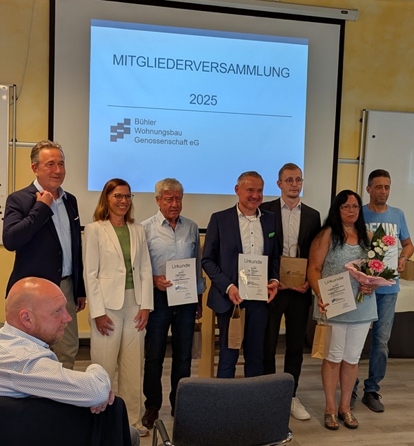 Frank Wolz und Andrea Meier ehren treue Mitglieder der BWG: Hans Striebel, Bernd Hischmann und Fabian Boost (Sparkasse Bühl), Rosa Maria Alom Santo und Cornel Kellner.